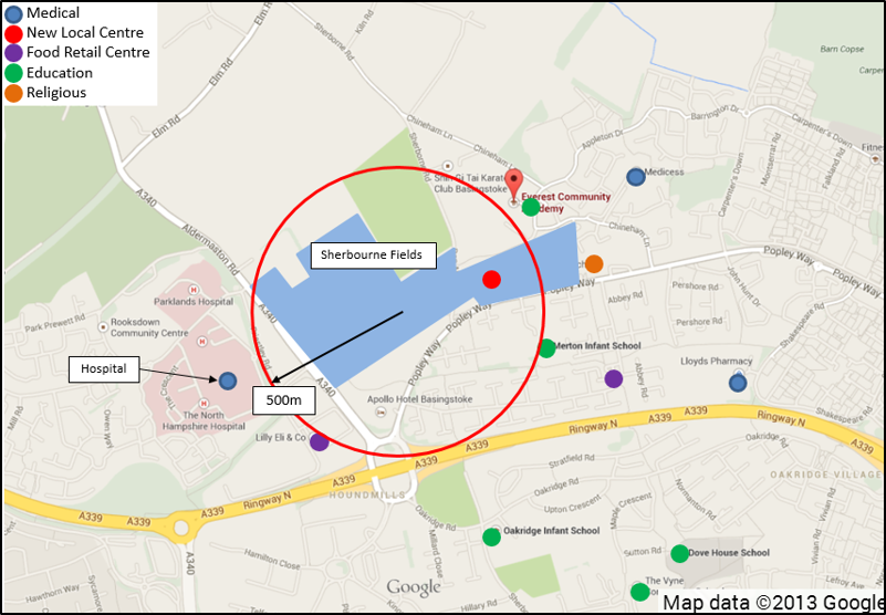 Sherborne Fields provides 784 residential units as well as local centre uses (including foodstore up to 500sqm), community office space up to 120sqm, as well as 10 hectares of public open space and allotments.
